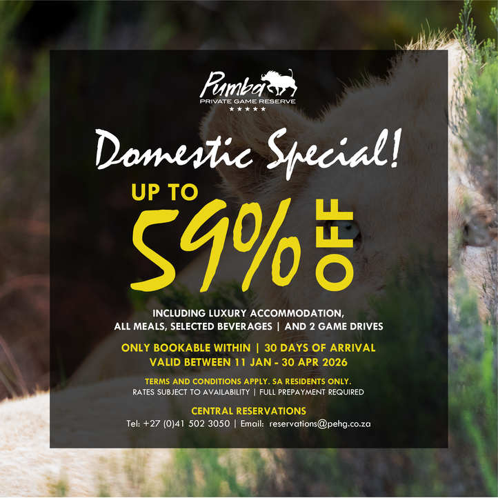 We have a reduced rate available for South Africans. Enjoy an all-inclusive big 5 safari, up to 59% off our normal rate: